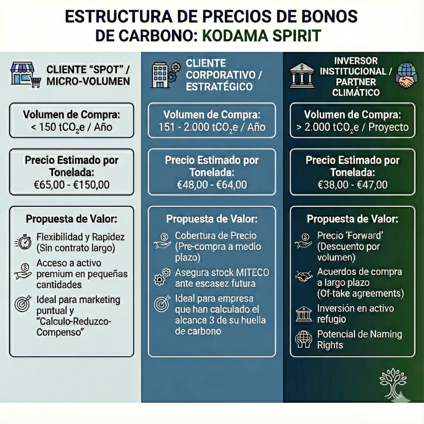 Es crucial entender que nuestro umbral mínimo de precio es innegociable, ya que cubre los costes reales de desarrollar proyectos en suelo en propiedad obligados a un periodo de permanencia de 50 años, una garantía de longevidad y custodia imposible de replicar por los bonos de rotación rápida de la industria de la celulosa o las subastas de las licitaciones públicas; sobre esta base de compromiso a medio siglo, fijamos el bloque Institucional (€38-€47/t) como suelo de coste real, escalando hacia el nivel Corporativo (€48-€64/t) para el cumplimiento de Alcance 3 y el segmento Spot (€65-€150/t) para necesidades puntuales, asegurando así que cada euro financia la supervivencia del bosque a largo plazo y no un mero certificado low cost internacional.